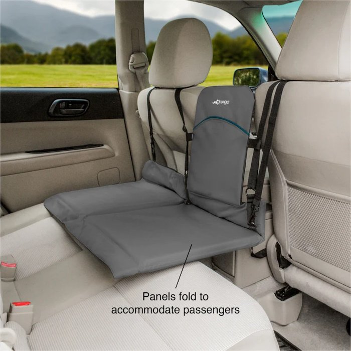 With a few simple attachments this padded bridge connects between seats, providing the extra comfortable space that they need to have a happy ride. This bridge conveniently folds up so Fido can invite a human passenger to join him in the back without having to give up the bridge. It can also be folded up to store items that require more space.