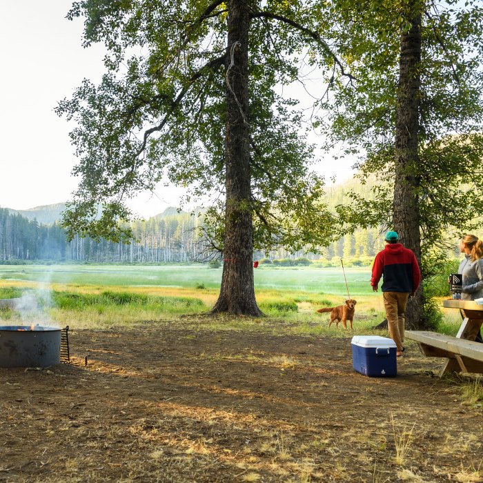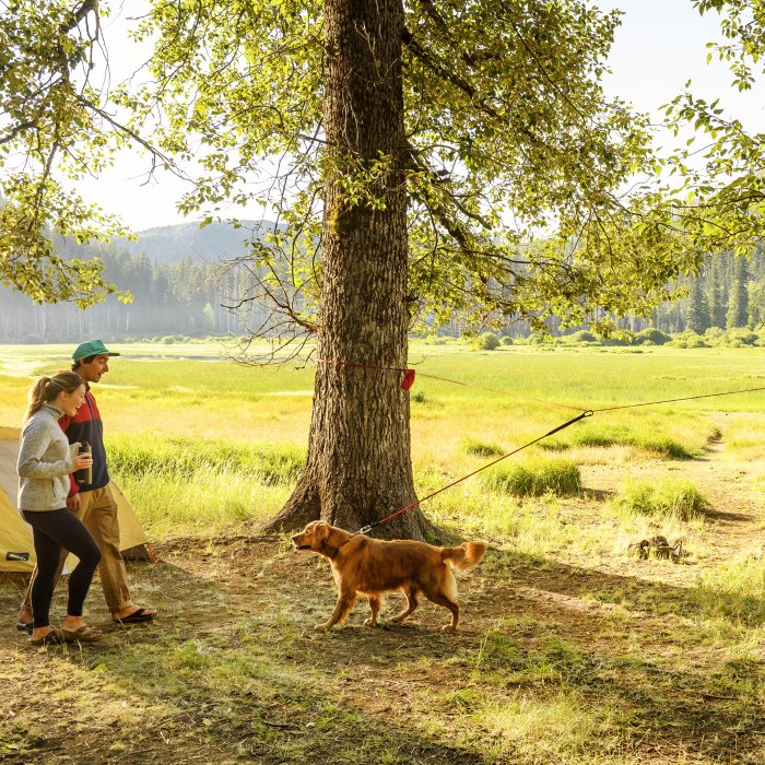 Dogs can explore their new surroundings while their human performs camp duties such as setting up the tent, cooking dinner, or building a fire.
