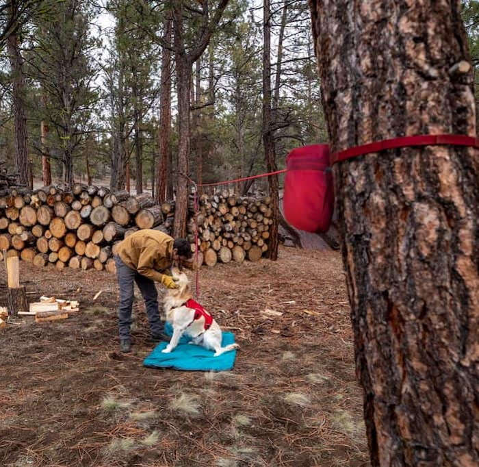 The Ruffwear Knot-a-Hitch is a campsite dog-hitching system using climbing-inspired components and hardware.