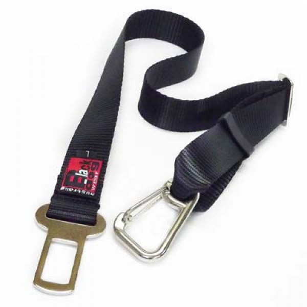 Adjustable Dog Car Seat Belt Strap with a Stainless Steel Carabiner at one end and a Clip in Tongue for Seat Belt Buckle at the other (compatible with most makes of vehicle – not compatible with some older Volvo cars).
