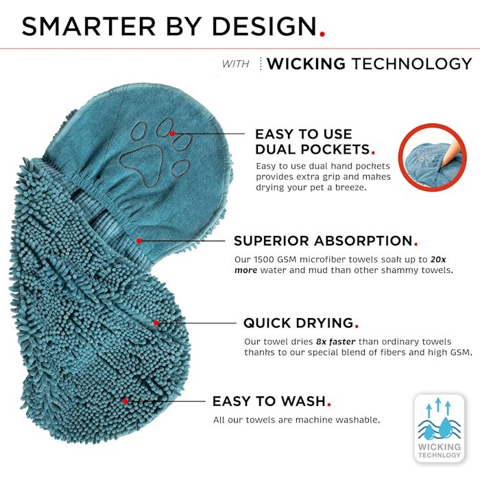 SUPER absorbent microfiber soaks up to 20X MORE Water and mud than other Shammy towels. Dries dogs 8X FASTER than a cotton towel or blow dryer