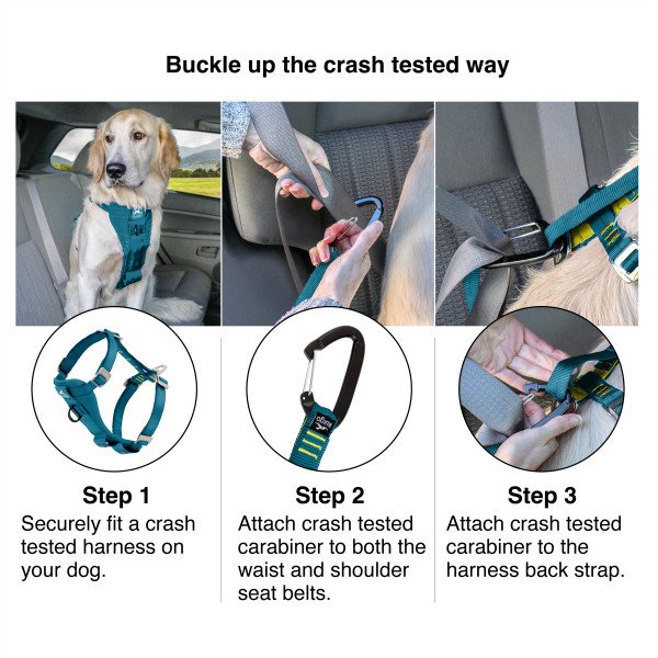 The harness attaches to the car seat belt via a strong metal carabiner. Kurgo recommends using the carabiner to attach it directly to the seat belt, although for more freedom a longer tether is included.