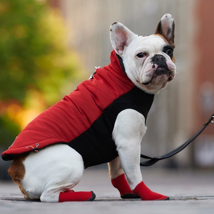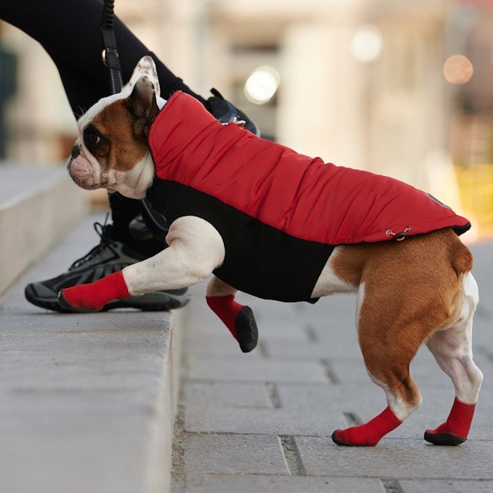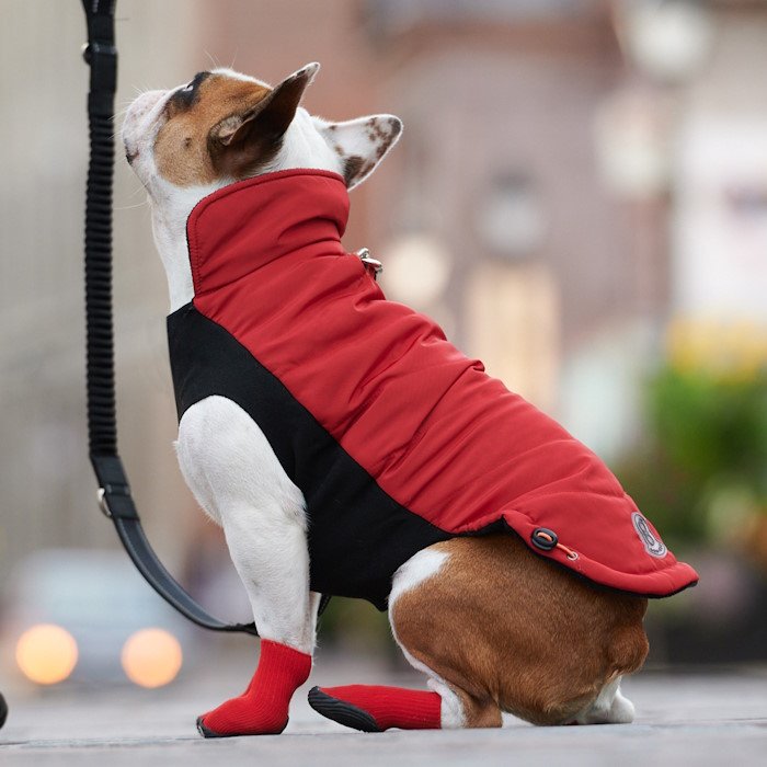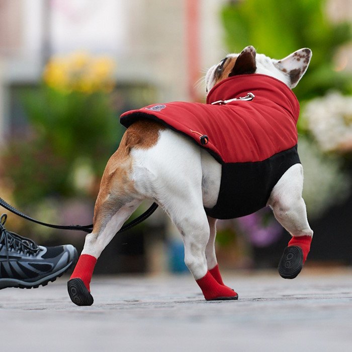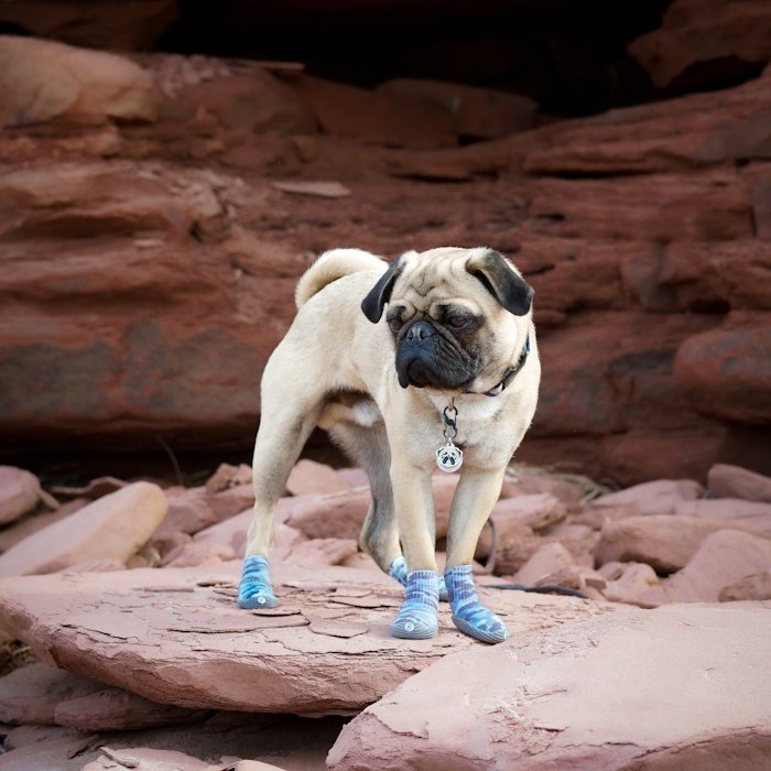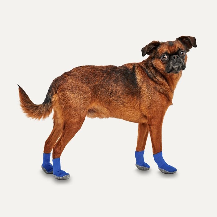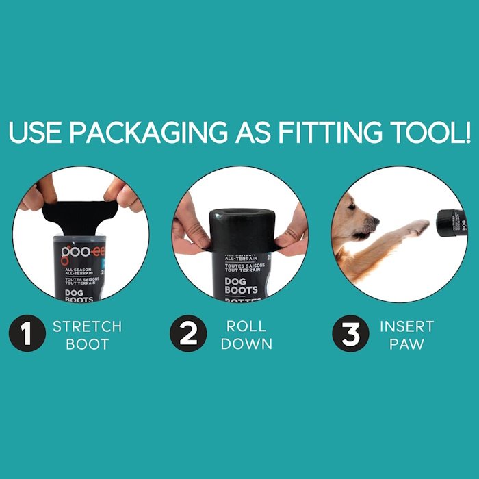 Insert two index and middle fingers on either side of the boot, using your thumbs. Squish down so you see the inside bottom of the boot as you would for a pair of human socks. Face your dog, stretch boot’s opening to its maximum and insert the dog’s front paw with a top-down approach. Continue to shimmy the boot until the paw is fully covered and smooth out the rest of the boot until it covers the lower leg entirely. Make sure to adjust the boot until you ensure that boot slide all the way to the front of paw. Repeat on all other paws. To remove boots, simply roll down and pull off.