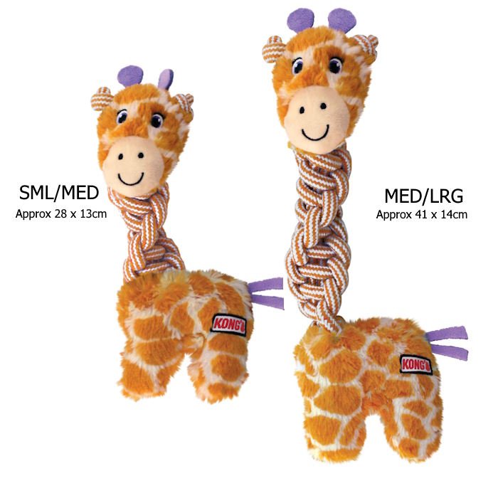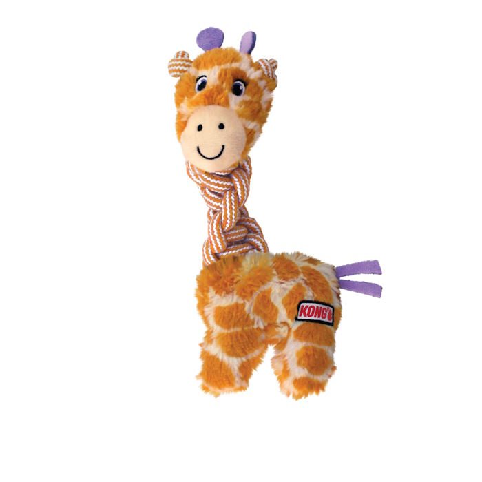 The KONG Knots Giraffe has a long braided neck satisfies thrashing instincts with an irresistible braid of durable cotton rope dogs love to chew.