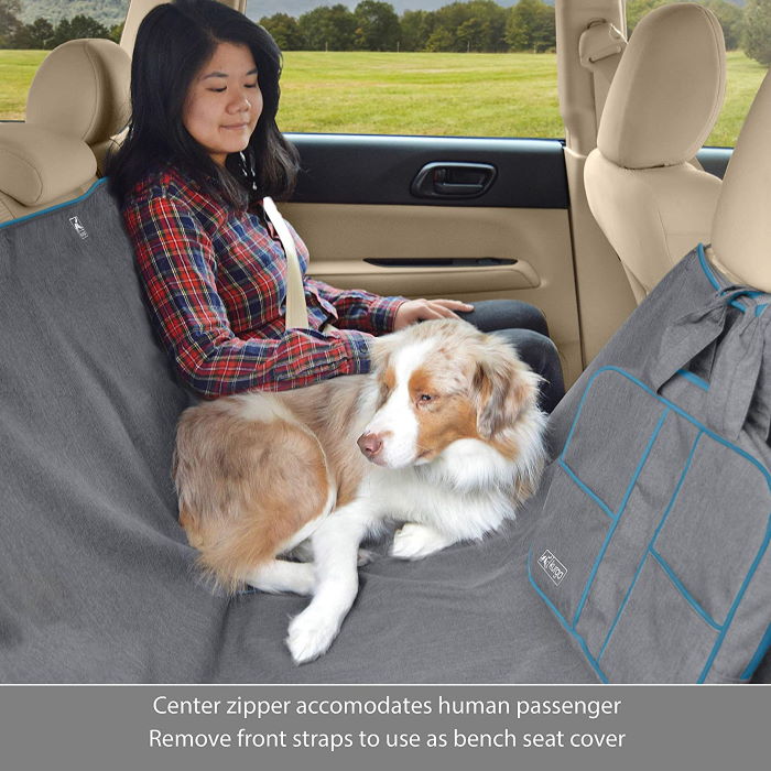 The centre zipper can be opened, and one side folded down to allow for human passengers to share the back seat with your pup. You can use it as a hammock or simply remove the front attachments to create a full seat cover.