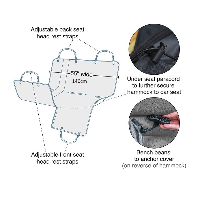 - Can be used as a dog hammock, or remove the front attachments to create a bench seat cover