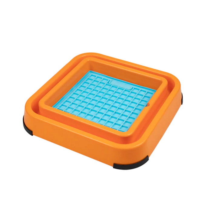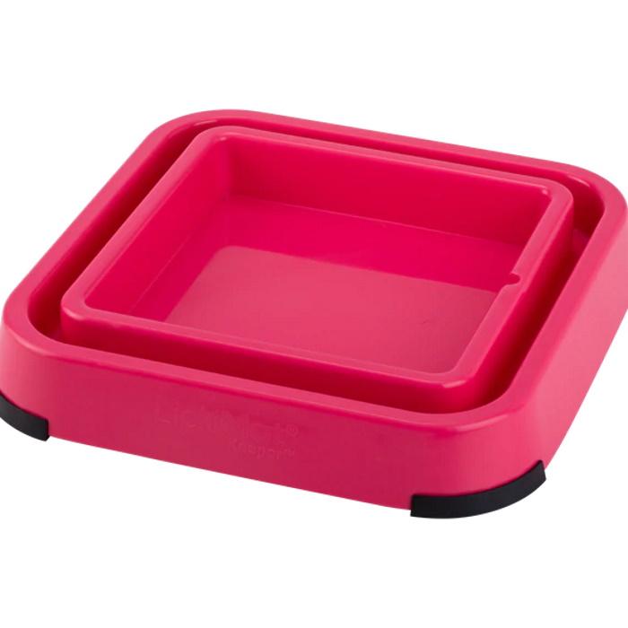 The LickiMat Keeper is designed as both a LickiMat Pad Holder and a dog food bowl. This square-shaped holder helps to contain spills and messes and keep the bugs away. It is designed to prevent pets from moving or chewing their LickiMats.