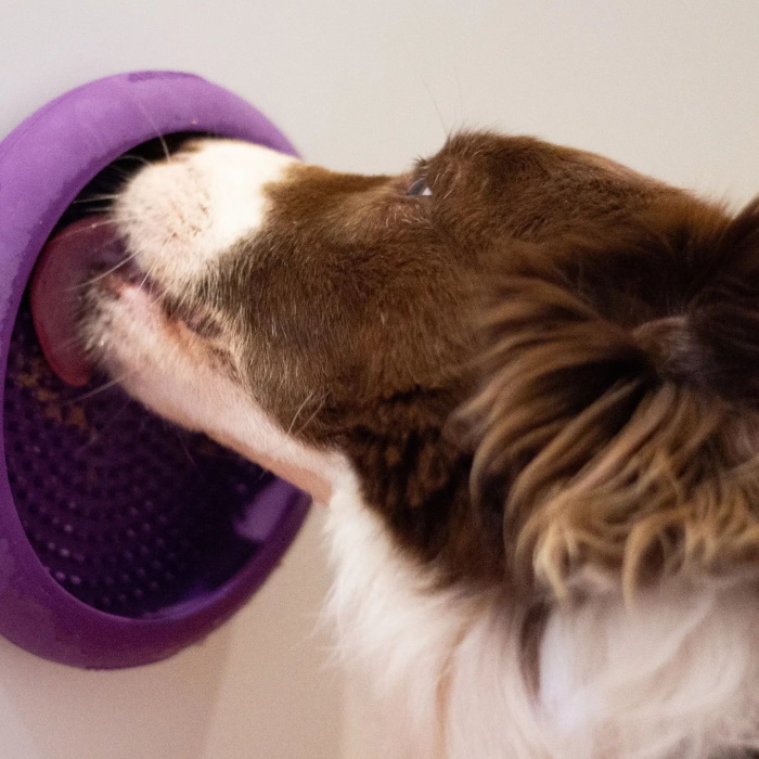 You can sprinkle kibble or dry dog treats in between the nubs or use treat pastes when you place the LickiMat on walls or windows. The UFO design features raised walls to keep food and saliva inside the bowl for mess-free slow-feeding and entertainment. You can freeze pet-friendly bone broth or frozen treats inside the bowl to encourage repetitive licking for relaxation.