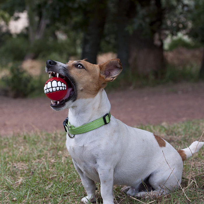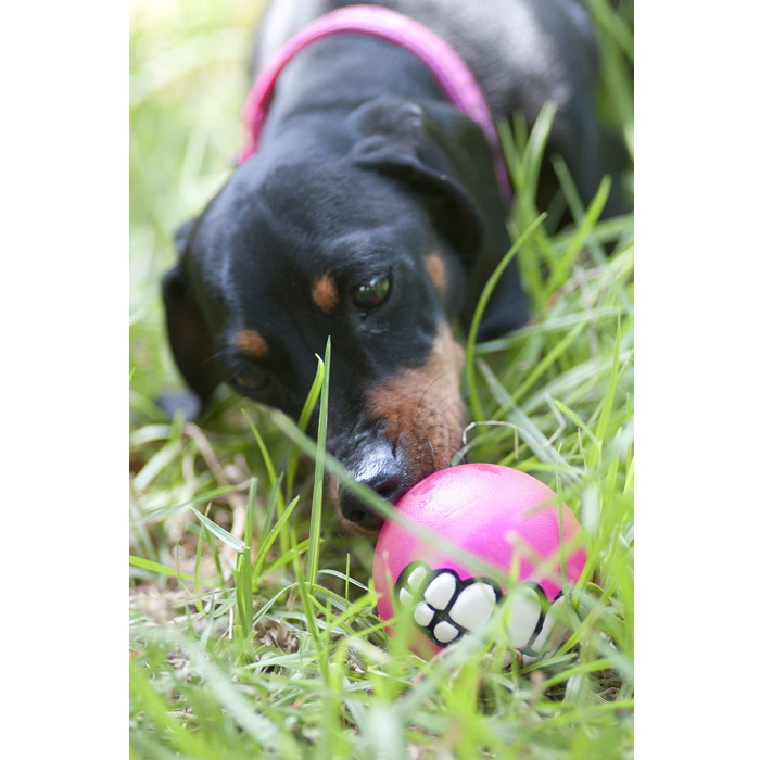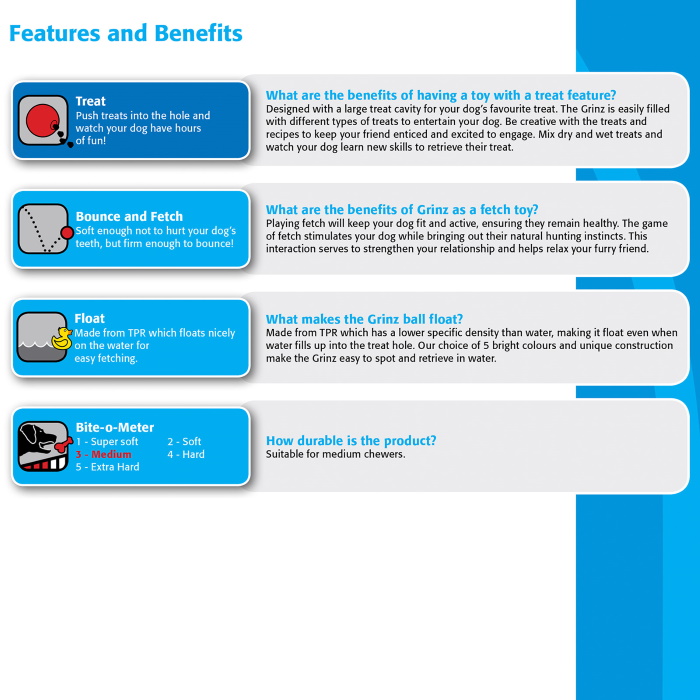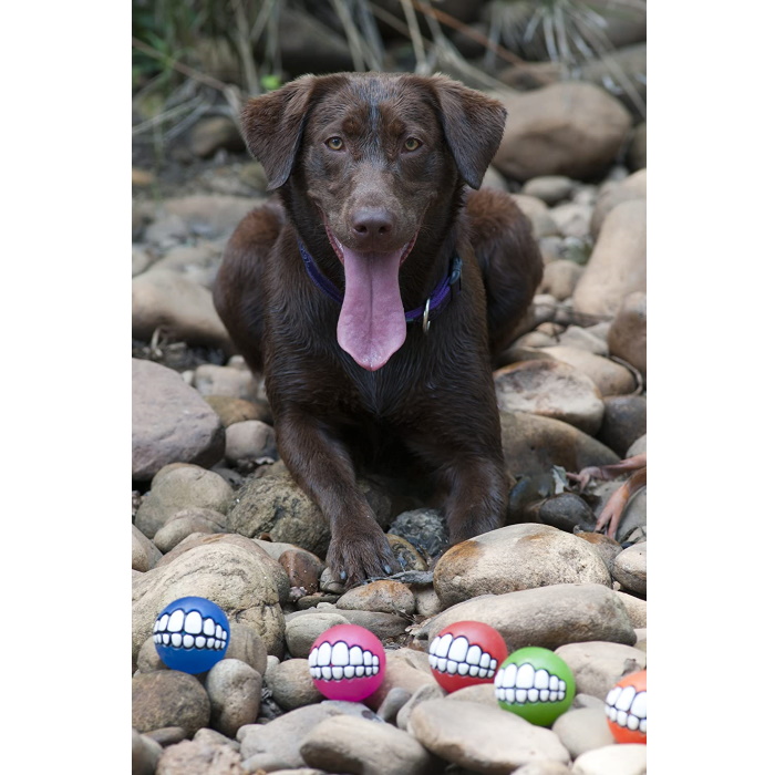 Non toxic or abrasive, the Grinz are available in a variety of colours and 3 sizes to suit most dogs. The bright colours keep the ball highly visible during games of fetch.