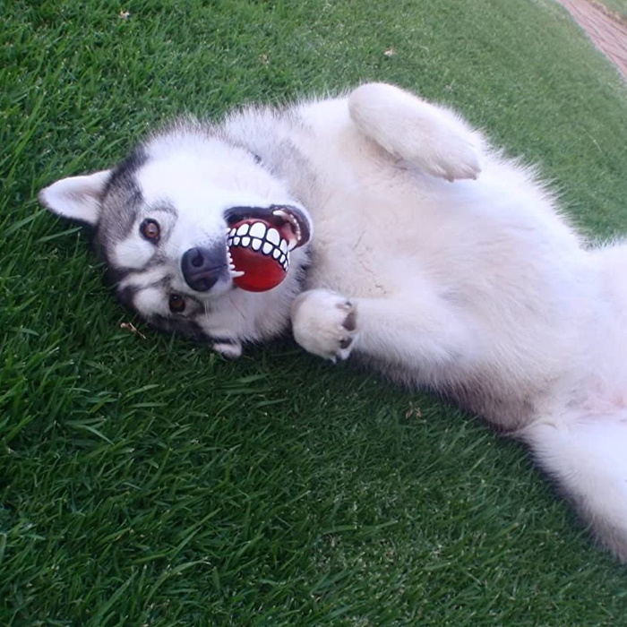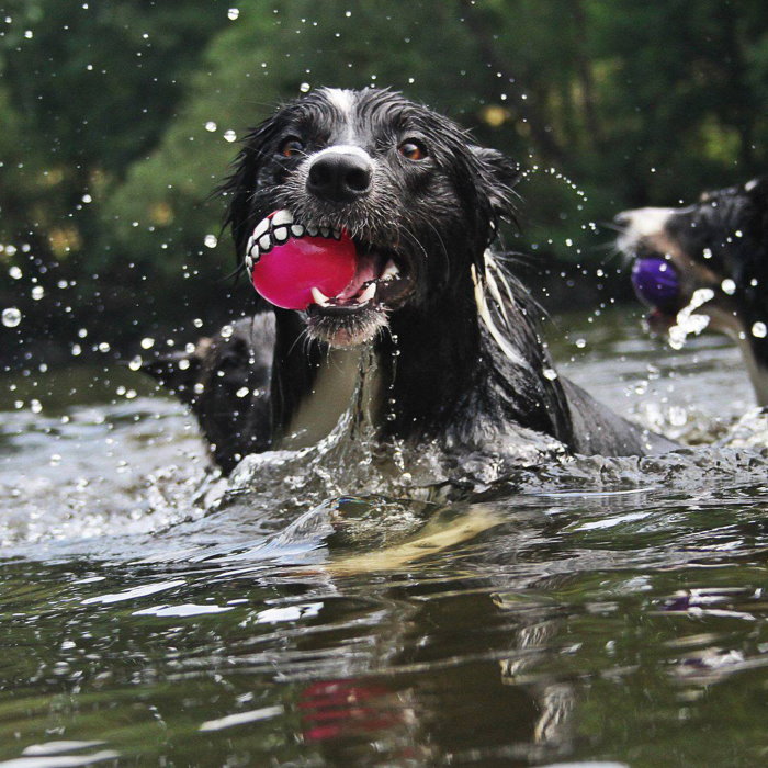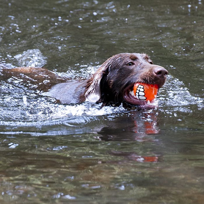 Soft enough to be gentle on your dog’s teeth but firm enough to bounce and floats in water.