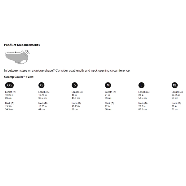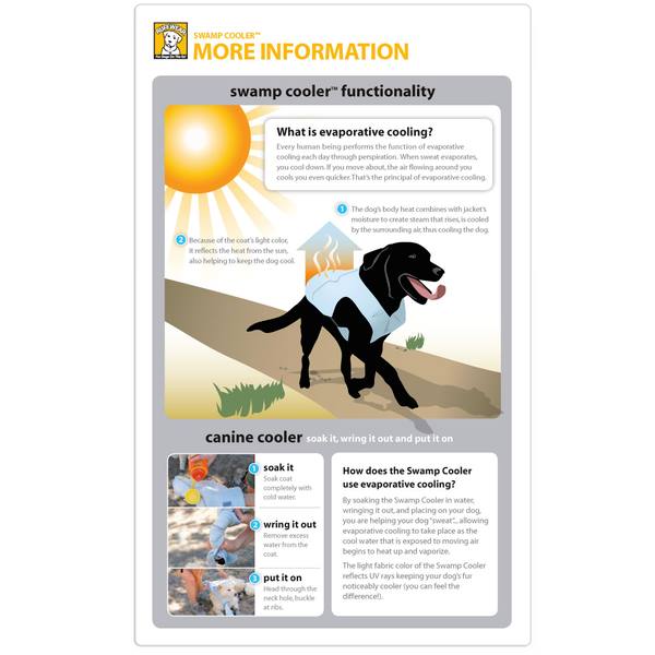 Just soak the dog coat in cool water, wring out the excess and place on your dog. The Swamp Cooler will keep your dog cool for several hours – depending on how hot it is and the humidity. It is easy to renew the evaporative cooling with water at any time. The light-coloured fabric reflects solar radiation, while evaporative cooling pulls heat from the dog.