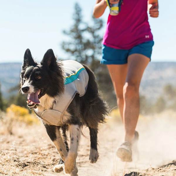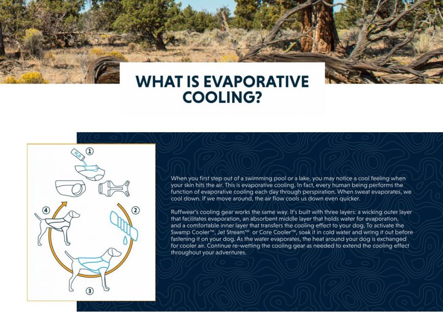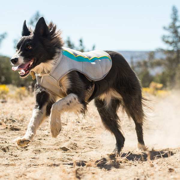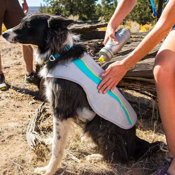 The Ruffwear Cooling Coat – Swamp Cooler provides protection from the sun and cooling through evaporation.