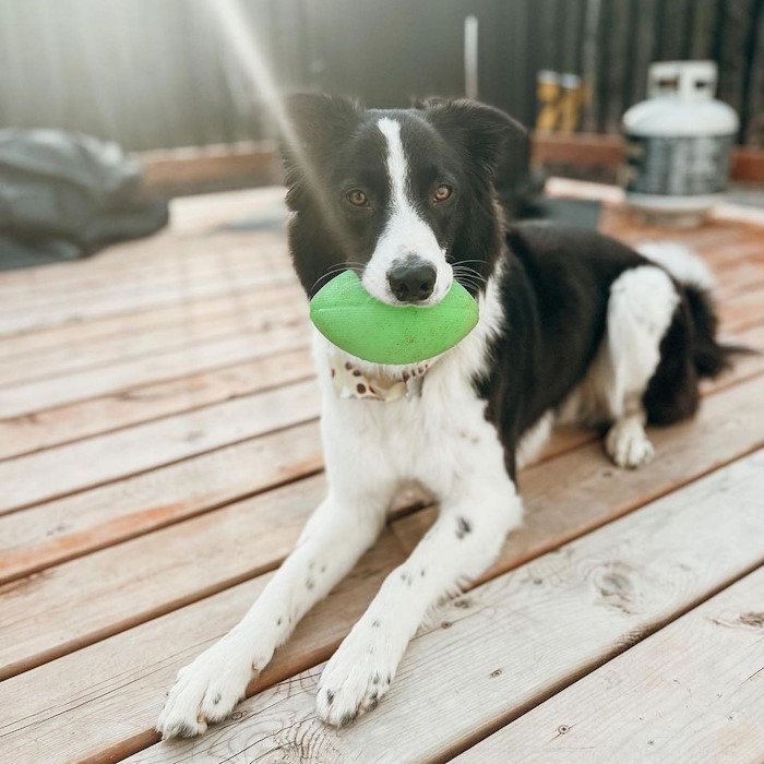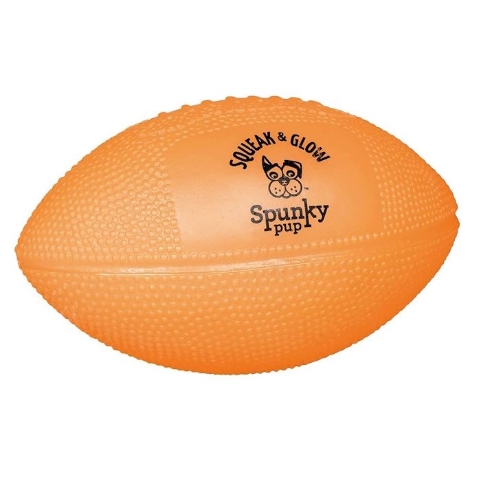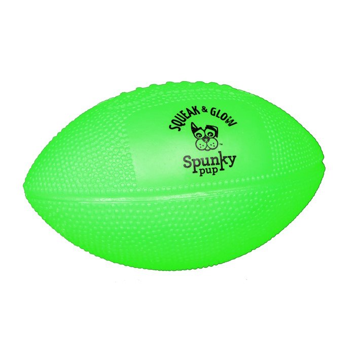This Glow In The Dark Football dog toy by Spunky Pup is a soft, durable, non-toxic toy. It is great for indoor or outdoor play.