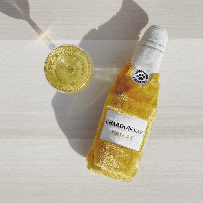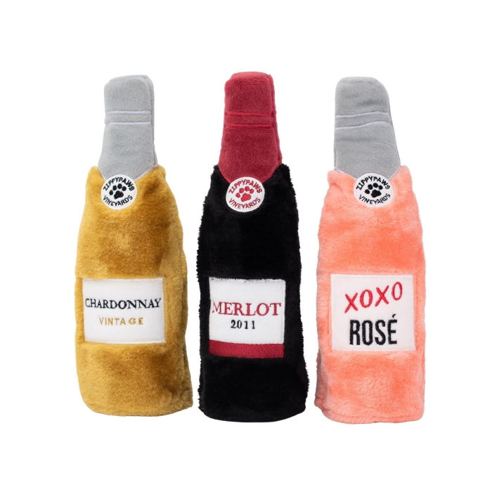 This 3-pack squeaky and crunchy dog toy set features three different wine bottles (Merlot, Rosé, and Chardonnay).